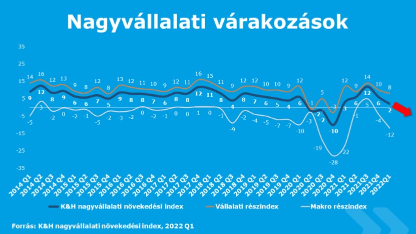 Újabb 4 ponttal mérséklődött a K&H nagyvállalati növekedési index az első negyedévben a tavalyi utolsó negyedév 6 pontos csökkenése után. A mutató – amely mínusz 100 és plusz 100 pont közötti értéket vehet fel – jelenleg 2 ponton áll. Érdemes kiemelni, hogy a felmérés február 14. és 28. között adott válaszok alapján készült – arról ad tehát képet, amit a cégek az ukrajnai konfliktus kezdetén vártak.