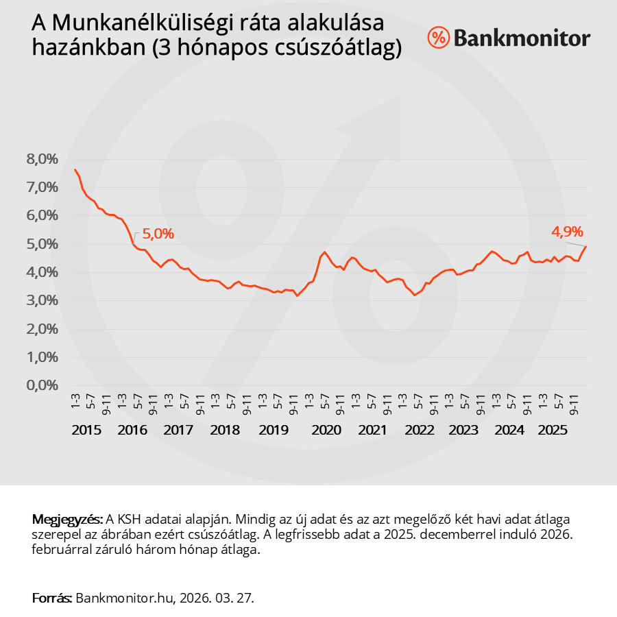 A KSH legfrissebb adatai alapján a munkanélküliségi ráta 4,9 százalékra emelkedett hazánkban a 2025. december és 2026. február közötti időszakban. (Ez az adat a kérdéses három hónapban mért érték átlaga.)