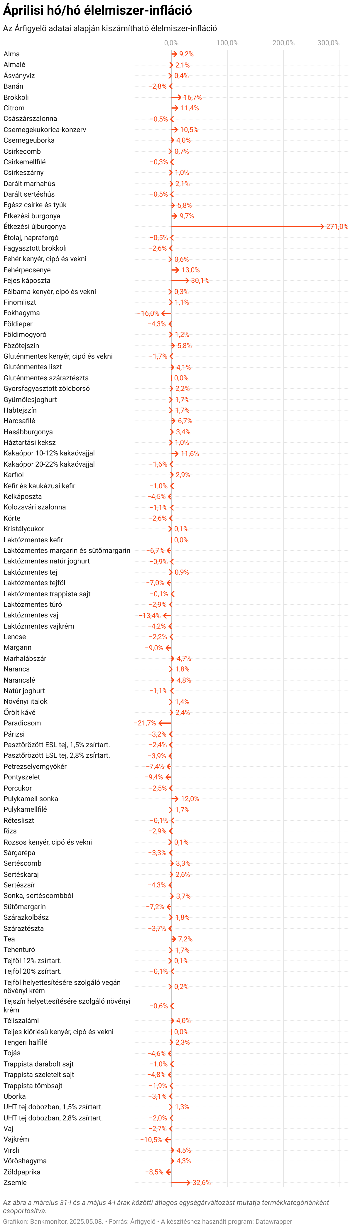 Az újburgonya árának rendkívüli, 271%-os drágulása jelentősen torzítja a teljes képet. Amennyiben ezt a kiugró tételt figyelmen kívül hagyjuk, az élelmiszerek átlagos havi drágulása jóval visszafogottabb, mindössze 0,59%-os mértékű volt áprilisban.