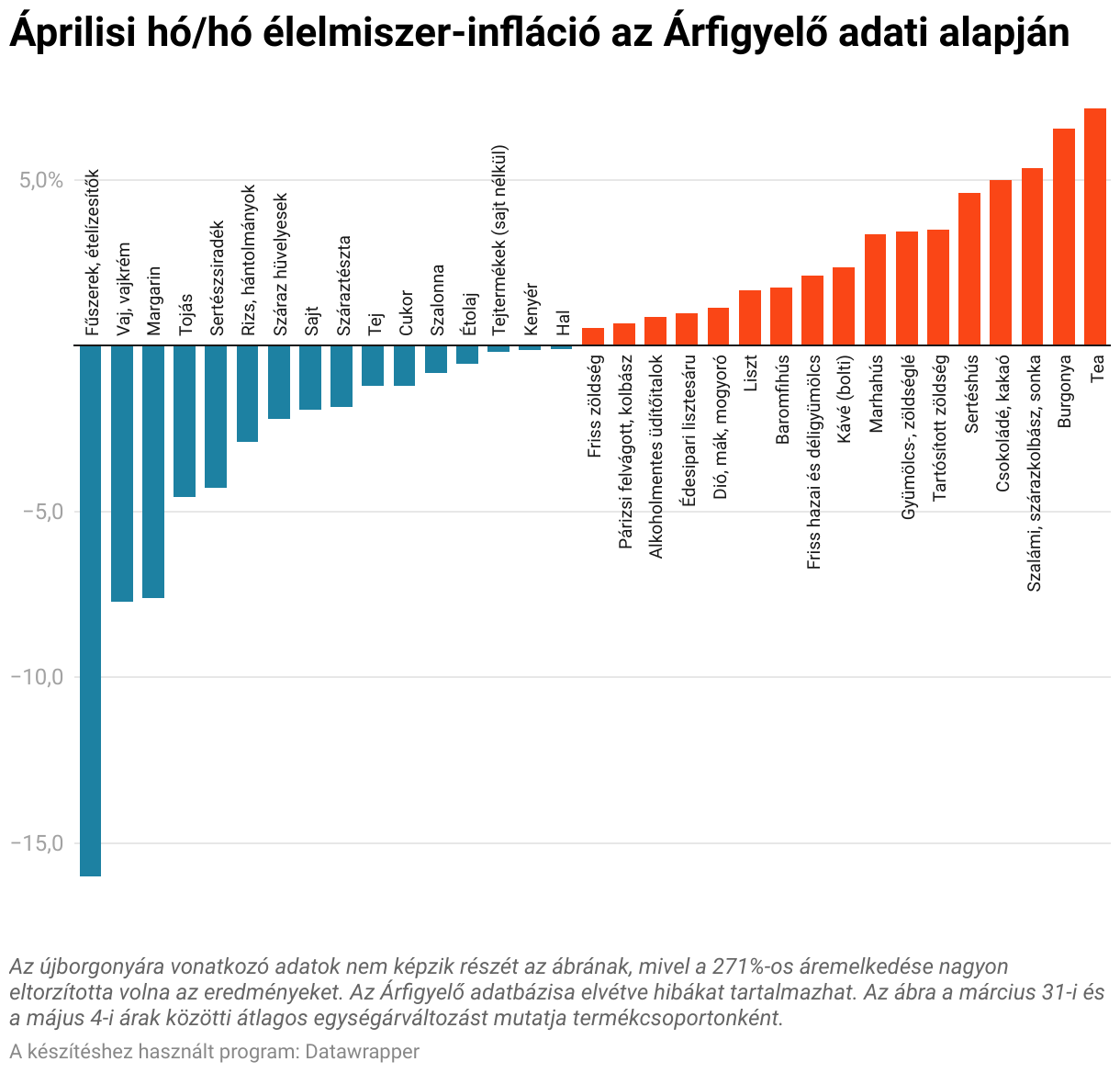 Az áremelkedések mellett több termékkategóriában is örvendetes árcsökkenés volt megfigyelhető áprilisban. A legnagyobb mértékben a fűszerek és ételízesítők ára esett vissza, 16%-kal lettek olcsóbbak. A tejtermékek közül a vaj és vajkrémek ára mérséklődött jelentősen, 7,71%-kal; ezen belül például a laktózmentes vaj 13,37%-kal, míg a vajkrém 10,54%-kal került kevesebbe. A margarinok ára is kedvezően alakult, átlagosan 7,61%-os csökkenést mutatva – a hagyományos margarin például 8,97%-kal, a sütőmargarin pedig 7,17%-kal lett olcsóbb. A tojás ára 4,56%-kal, a sertészsiradéké pedig 4,29%-kal csökkent.
