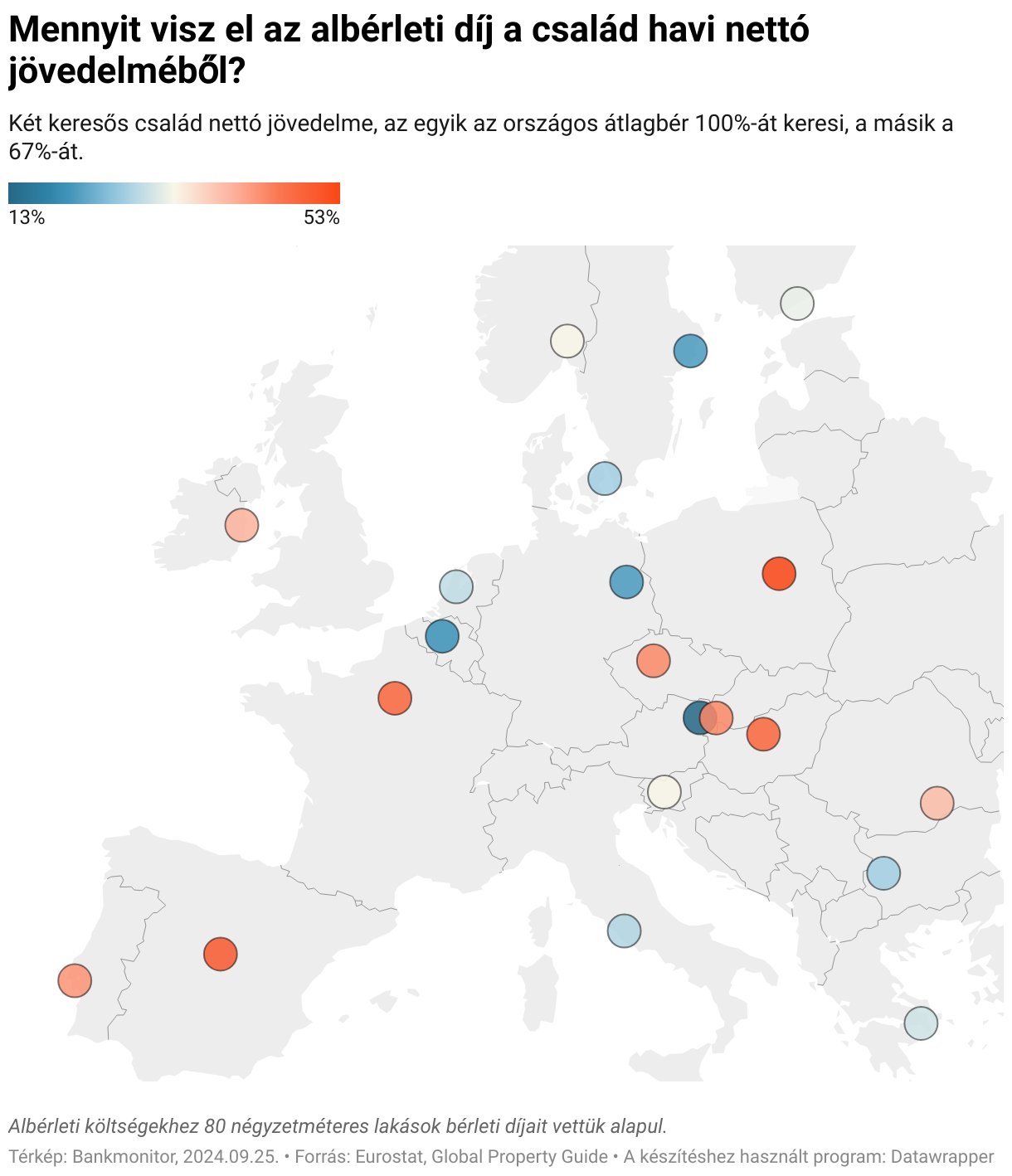 A Bankmonitor elemzésében 2023-as adatok alapján összehasonlította az európai nagyvárosok albérleti költségeit egy kétkeresős, négyfős család bevételeivel. A család egyik tagja az országos átlagbér 100%-át, a másik pedig annak 67%-át keresi, és a számításokban ezeket a jövedelmeket vették alapul. Magyarországon egy ilyen család havi nettó jövedelme 1908 euró (729 ezer forint) , ebből Budapesten egy átlagos 80 négyzetméteres albérletre 920 euró (351 ezer forint) megy el, ami a bevételük 48%-át jelenti. Ugyanez Prágában 44%, Varsóban pedig 53%.