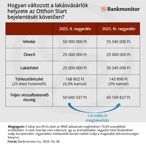 Vagyis az Otthon Start kihasználásával a fél év alatt látott áremelkedés ellenére is havonta 24 900 forintot spórolhatott a vevő, ami összességében 7,47 millió forint megtakarítást eredményez.
