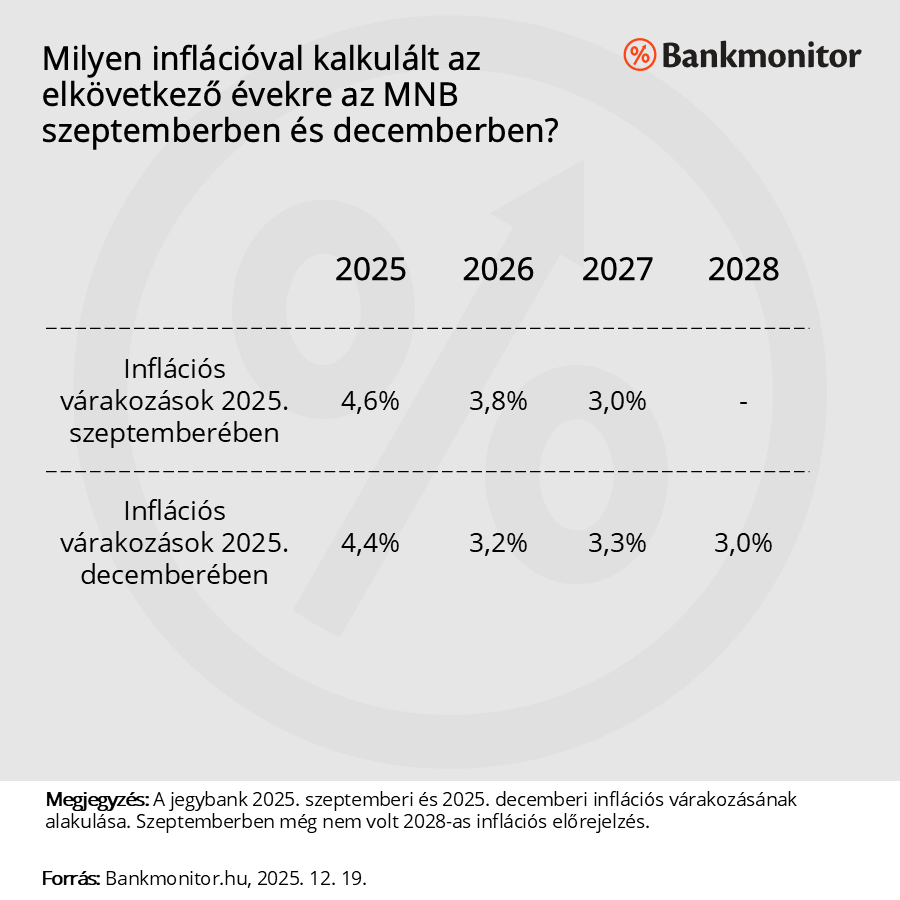Talán ennél nagyobb meglepetés, hogy a jövő évi inflációs várakozásain is érdemben csökkentett a jegybank a szeptemberi adatokhoz képest. Az ősz elején még 3,8 százalékos átlagos áremelkedést várt a jegybank jövőre, jelenleg már csak 3,2 százalékos drágulással számolnak 2026-ra. Azt hozzá kell tenni, hogy 2027-ben minimálisan rontotta a kilátásokat a jegybank: 3,0 százalék helyett már 3,3 százalékos inflációval számolnak.