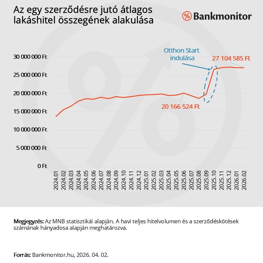 Az Otthon Start bejelentése előtti fél évben 2025. január és 2025. június között a lakáshitelek átlagösszege 19,7 millió forint körül alakult. 2025 októbere óta – akkor érkeztek el az új támogatott hitelek szerződéskötésig – már az átlagösszeg 27 millió forintra nőtt.