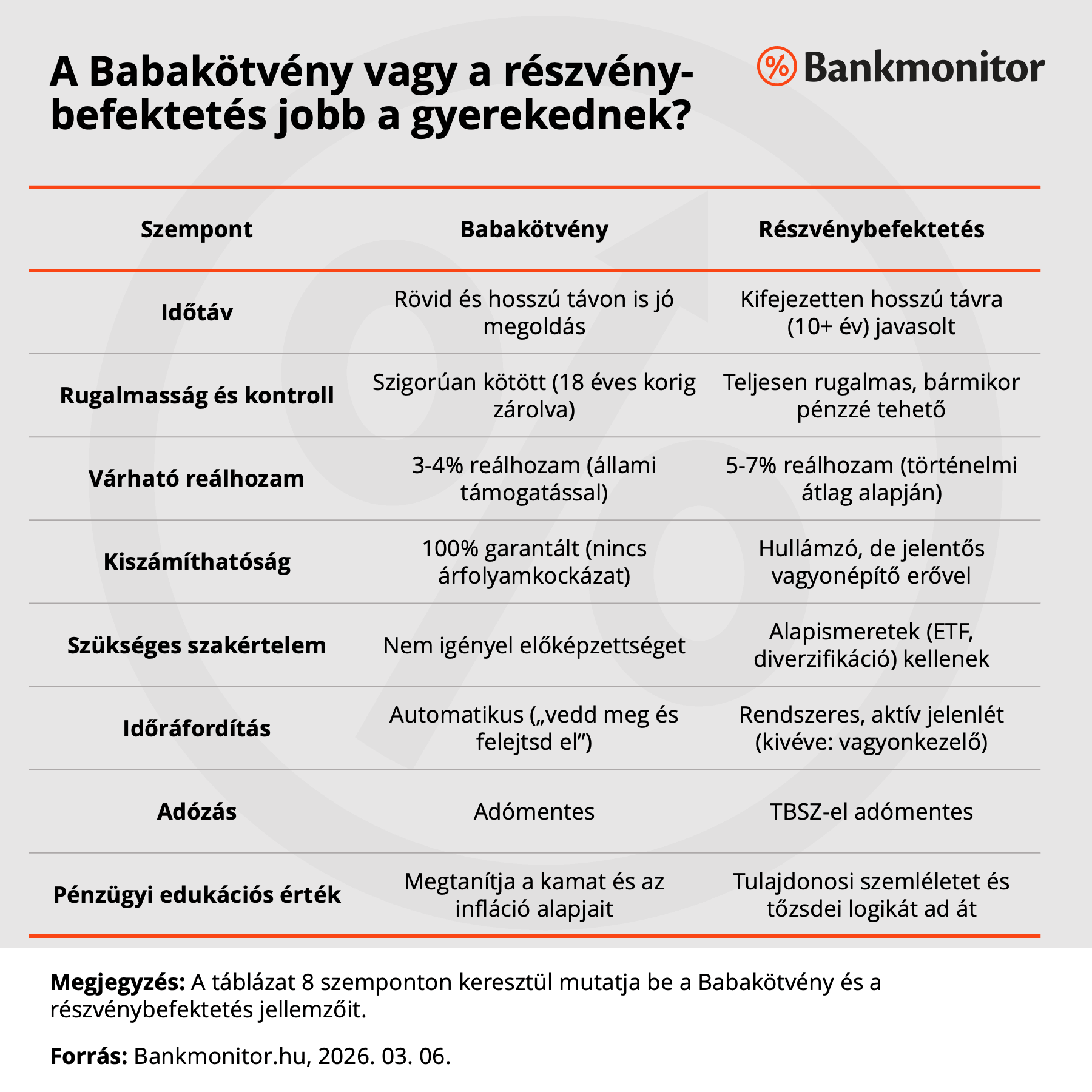 A következő sorokban olyan lényeges szempontokat kapsz a kezedbe, amelyek birtokában kristálytisztán el tudod majd dönteni, hogy a Babakötvény meleg takarója, vagy a részvények dinamikus motorja illik-e jobban a ti életetekhez.
