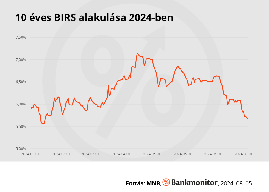 Először is, vessünk egy pillantást a BIRS-re, ez a mutató azt mutatja meg, hogy a bankok milyen kamat mellett adnának hitelt egymásnak hosszú futamidőre. A mutató értéke elmúlt héten 0,4%-kal csökkent, így 2024. augusztus 5-én a 10 éves BIRS 5,68%-on állt, ami 2024 januárja óta a legalacsonyabb szint.