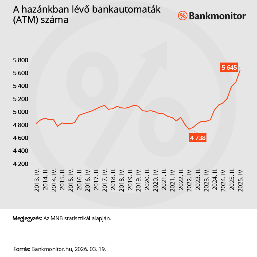 Gyakorlatilag 2022. év vége óta folyamatosan emelkedik a magyarországi ATM-ek száma. Az akkori 4738-as szinthez képest tavaly év végén már 907-tel több bankautomata volt hazánkban.
