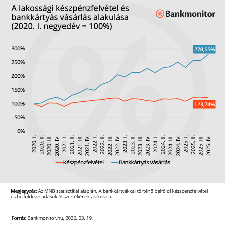 Ahogy fentebb is látható a belföldi lakossági bankkártyás készpénzfelvétel 5 év alatt az inflációtól is jóval elmaradva 23 százalékkal bővült. Míg ugyanezen időszak alatt – 2020. I. negyedév és 2025. IV. negyedév között – a belföldi lakossági bankkártyás vásárlások összvolumene 178,55 százalékkal emelkedett, azaz több, mint két és félszeresére nőtt.