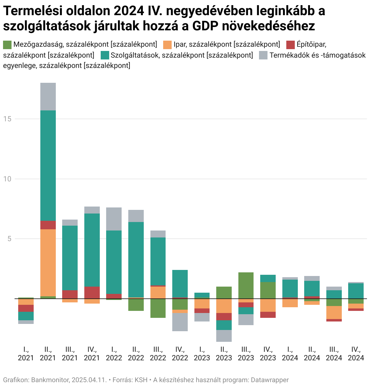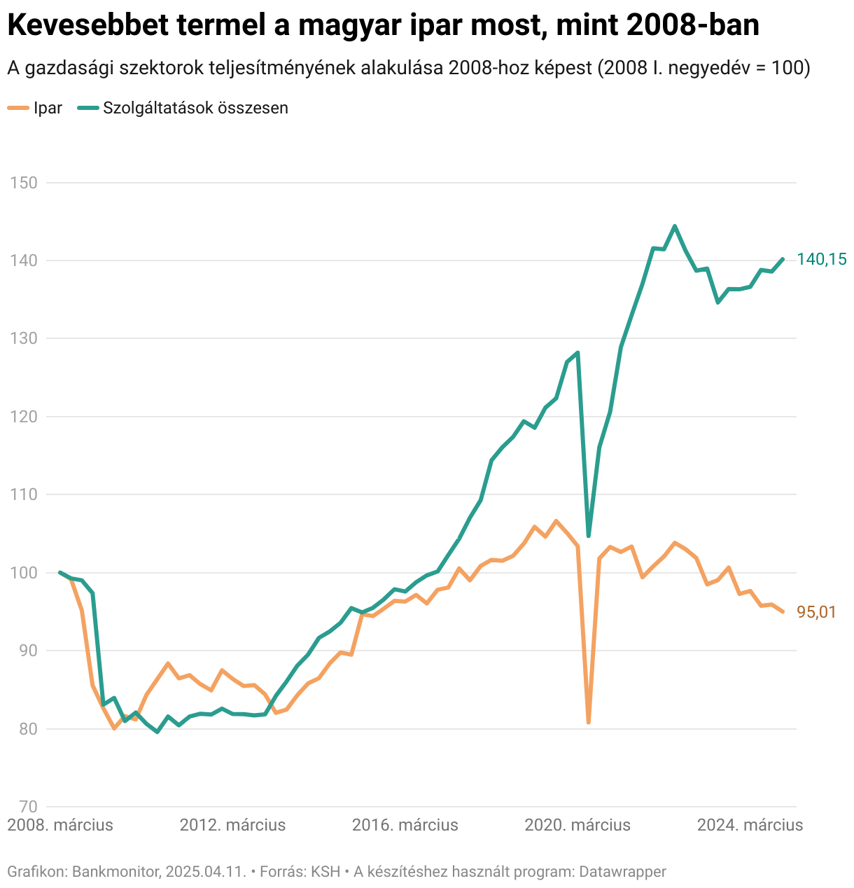 Ugyanekkor a szolgáltatási szektor aránya eközben 56,3%-ról 61,0%-ra bővült. Fontos kérdés azonban, hogy ez a növekvő súly elsősorban a szektor kiemelkedő belső dinamikájának köszönhető-e, vagy inkább a gazdaság más területeinek, kiváltképp az iparnak a relatív lemaradása, stagnálása emeli ki a szolgáltatások szerepét? Ennek megválaszolása kulcsfontosságú a gazdasági helyzet értékeléséhez.