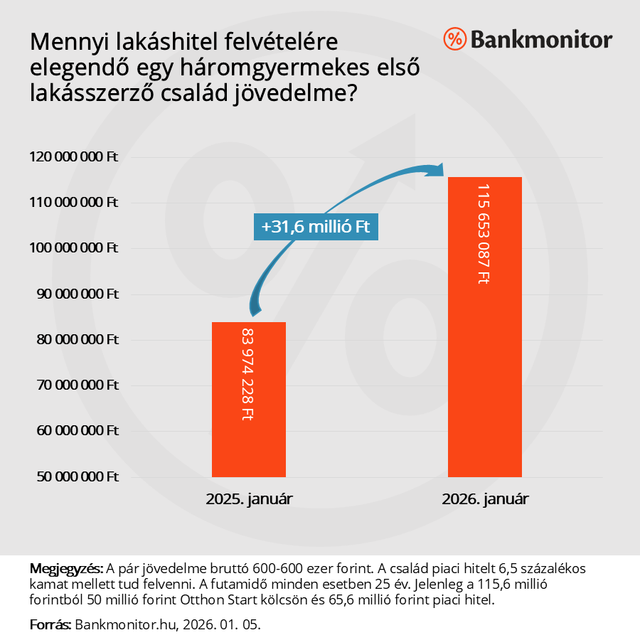 A család 2025. év elején nettó 945 ezer forintos bevétellel rendelkezett. Ebben benne volt az akkor elérhető családi adókedvezmény és a családi pótlék is. Egy éve ezen összegnek legfeljebb a 60%-a, azaz 567 ezer forint fordítható hiteltörlesztésre. Az akkor elérhető 6,5 százalékos kamatozású 25 éves futamidejű piaci hitelből 83,9 millió forintot tudott volna felvenni a család, ekkora hitel törlesztőjét bírta el a fizetésük.