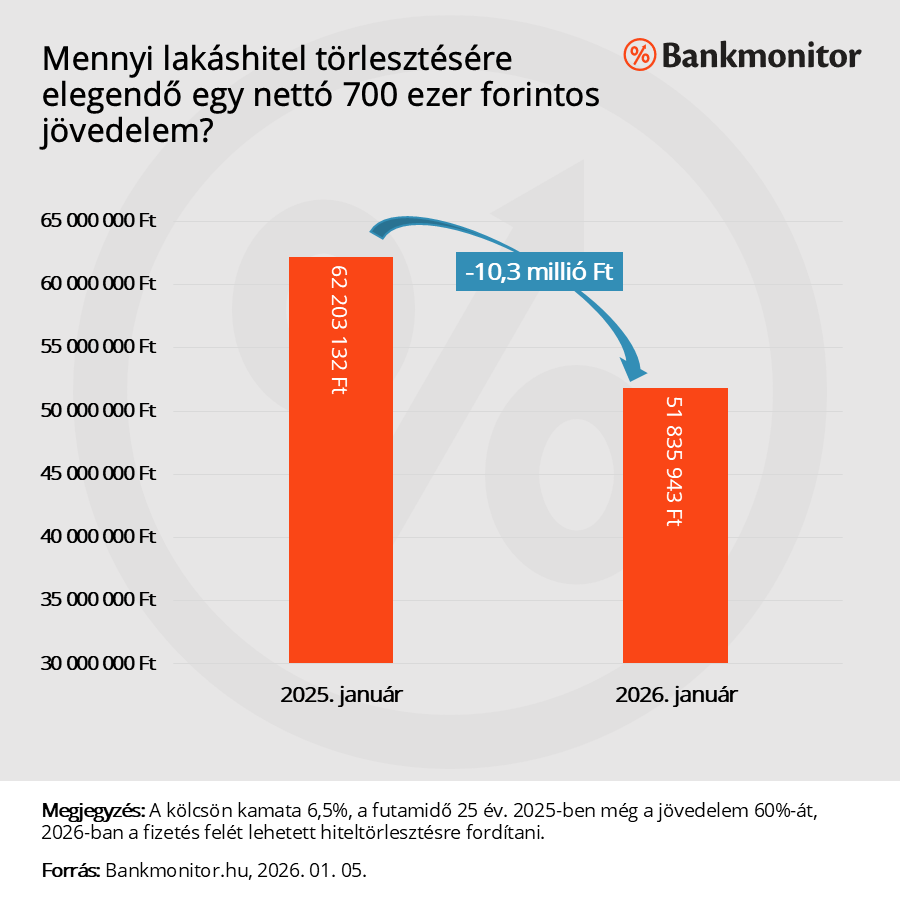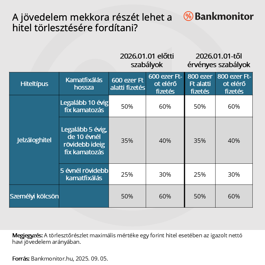 Az eddigi jóhírek mellé érkezzen most egy kevésbé pozitív is. 2026. január elsejétől bizonyos esetekben a fizetésnek kisebb részét lehet már csak törlesztésre fordítani. Korábban a 600 ezer forintot elérő nettó fizetéseknél emelkedett meg az az arány, amit egy hitel havi részletére lehet fordítani, az idei évtől azonban már legalább nettó 800 ezer forintos bér szükséges a kedvezőbb jövedelemterhelési szabályok eléréséhez.