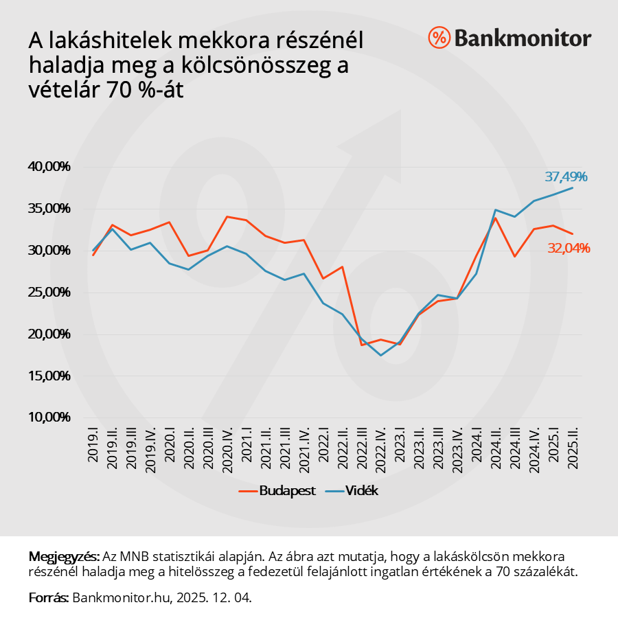 Budapesten a 2025 II. negyedévben kibocsátott lakáshitelek átlagosan a fedezeti ingatlan forgalmi értékének a 49 százalékát tették ki. Ugyanez az arány vidéken 52%. Nagyon leegyszerűsítve egy lakáshitel esetében – ahol egy fedezet van és reális áron veszik meg a lakást – a vételárnak durván a felét finanszírozzák kölcsönből az adósok.