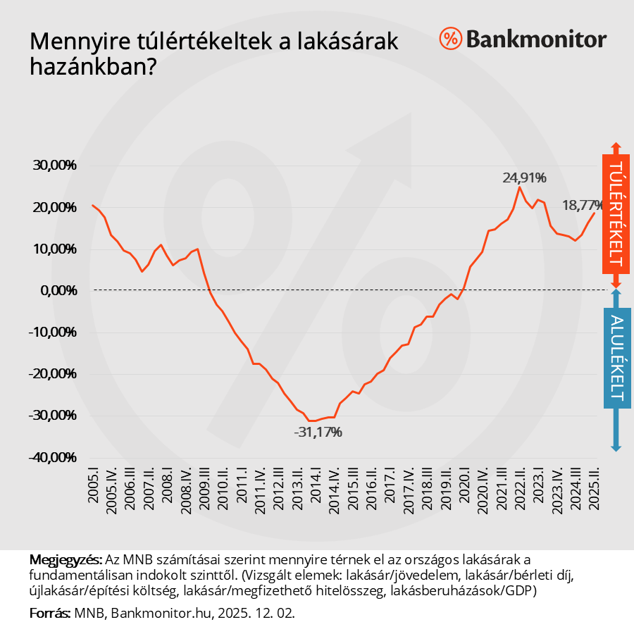 2022. II. negyedévében pedig még a jelenlegi helyzetnél is magasabb, 24,91 százalékos túlértékeltséget mért a jegybank, amely bő két év alatt lefeleződött. (2024. III. negyedévében még mindig túlértékeltségről lehetett beszélni, de annak mértéke már csak 12,17 százalék volt.)