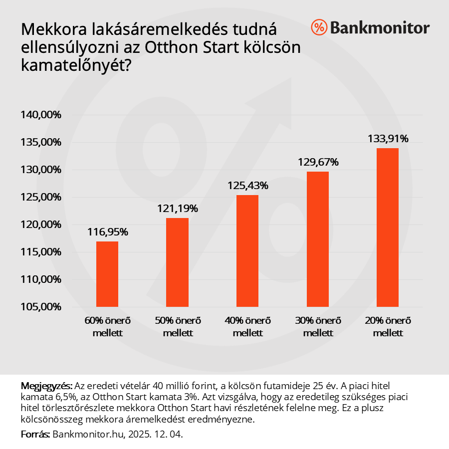 Ha a vevő 20% önerővel rendelkezik, akkor 32 millió forint kölcsön kell a vásárláshoz. A kérdéses összegre havonta 151 748 forintot kell fizetni 3% kamat mellett. Míg piaci, 6,5 százalékos kamatszint esetén már 216 066 forint lenne ugyanezen kölcsön törlesztője. A 216 ezer forintos részlet 45,5 millió forint 25 éves futamidejű, 3 százalékos kamatozású lakáshitel törlesztőjének felelne meg. Vagyis 13,5 millió forintos, azaz 33,91 százalékos áremelkedésig még kedvező az Otthon Start hitel.