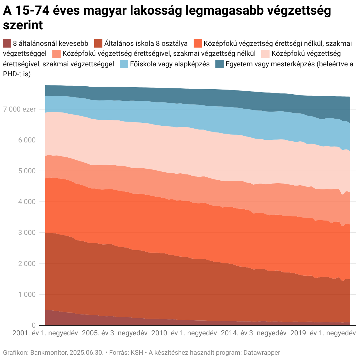 Ha a most vizsgált 2001-2020 közötti időszakot szemügyre vesszük, akkor jól látszik, hogy valóban egyre többen rendelkeznek diplomával a 15-74 éves lakosságon belül. Míg 2001 első három hónapjában 11,5% volt a főiskolai (alapképzés) vagy egyetemi (mesterképzés vagy magasabb) diplomával rendelkezők aránya, addig ez 2020 negyedik negyedévére 24%-ra hízott.