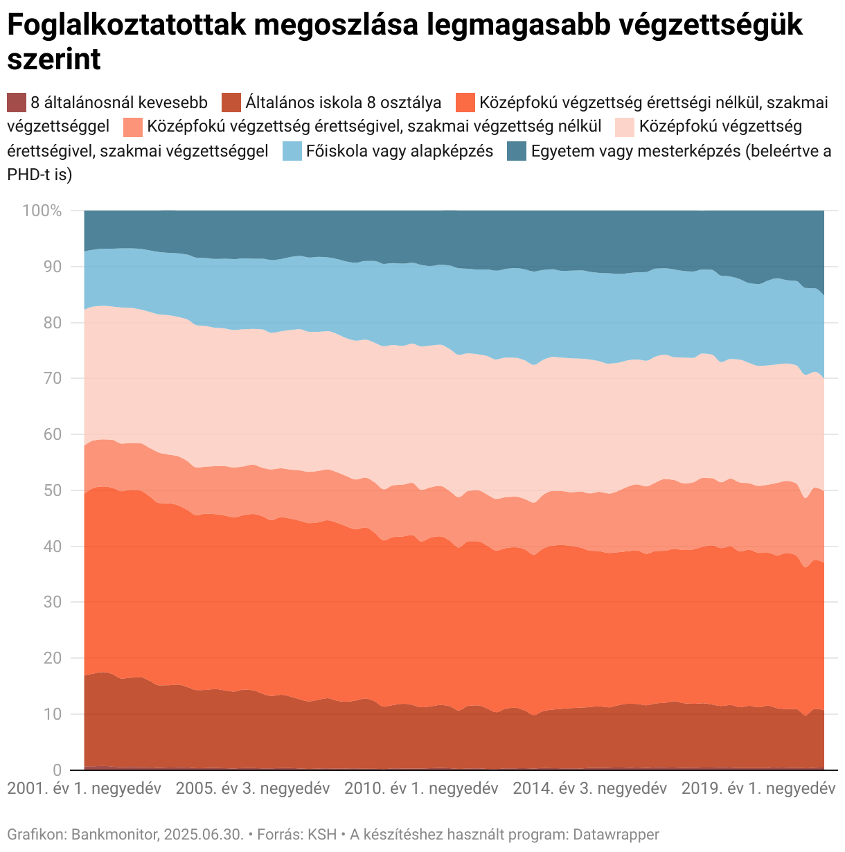 Természetesen itt is, mint a 15-74 éves népeség esetében a diplomások növekvő aránya tapasztalható. Azonban mivel az alacsonyabb végzettségűek aktivitási rátája általában alacsonyabb, így a diplomások nagyobb arányban képviseltetik magukat a munkaerőpiacon, mint a vizsgált népességben. Ennek tudható be, hogy 2001 első negyedévében a foglalkoztatottak 17,72%-a rendelkezett diplomával és 2020 utolsó negyedévére ez az arány 30,01%-ra nőtt. Vagyis 10-ből 3 munkavállaló rendelkezett diplomával.
