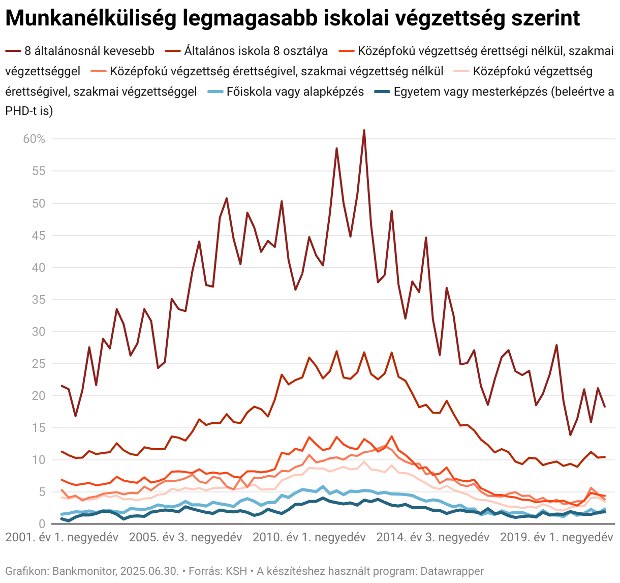Jól látszik, hogy a mester- vagy alapképzést végzetteknek legalacsonyabb a munkanélküliségi rátája. Ez igaz volt 2008 körül és 2020-ban is. Jól látni az ábrán, hogy még gazdaságilag nehezebb időszakokban is nagyon alacsony, 3-4%-os munkanélküliséggel számolhatnak az egyetemet végzettek. Ez persze nem csupán a diplomájukból fakad, hanem sokkal inkább abból, hogy a megszerzett tudásuknak köszönhetően olyan pozíciókban tudtak elhelyezkedni, amelyeket nem építenek le, vagy a lista végén szerepelnek ha leépítésről van szó.