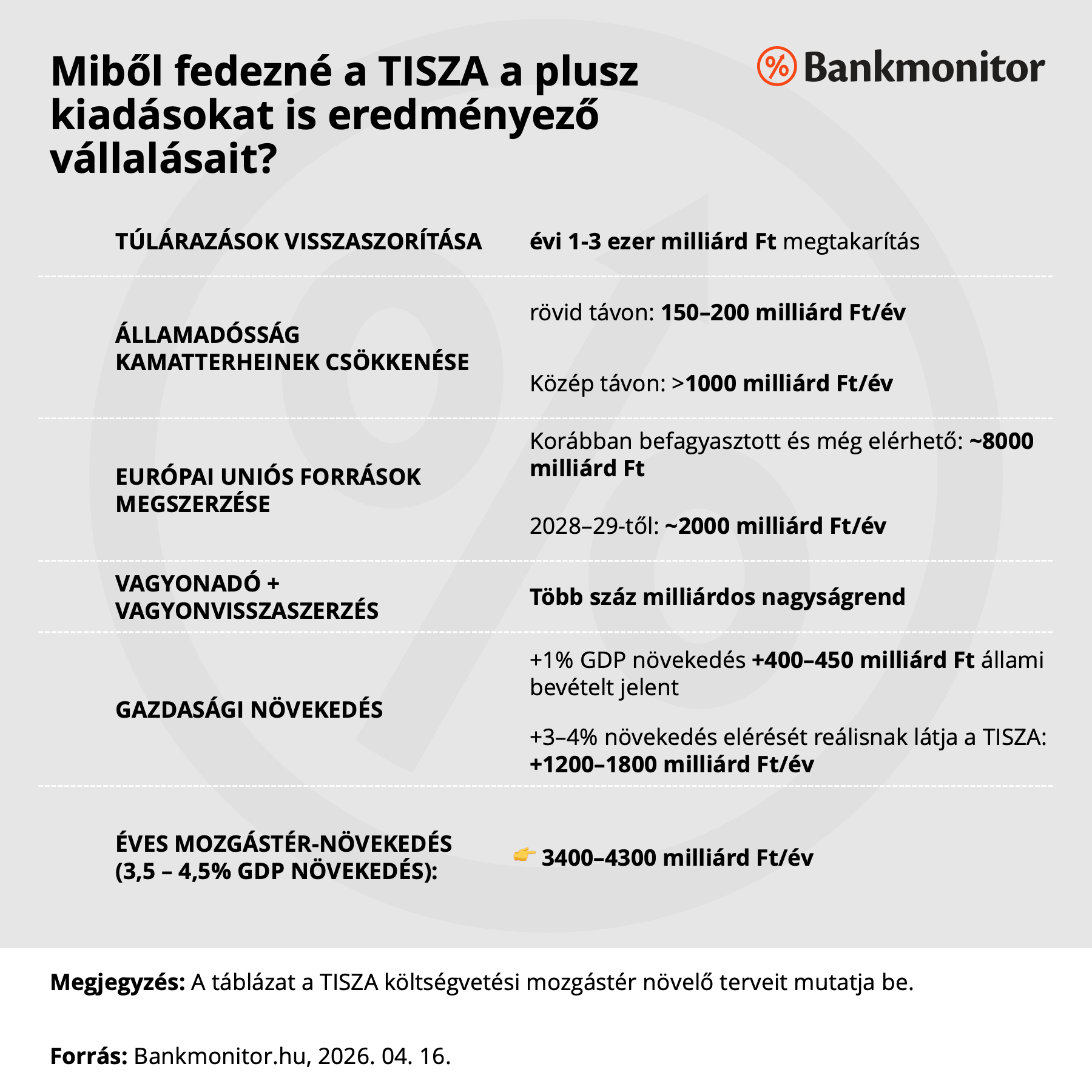 A program szerint mindehhez még a növekedési hatás is hozzáadódik, minden plusz 1 százalékpont GDP-növekedés 400-450 milliárd forinttal emelheti az állam bevételeit. Ez alapján a TISZA összesen évi 3400-4300 milliárd forintos többletmozgástérrel számol. A program legfontosabb üzenete mégis az, hogy a pénzügyi fordulat első számú forrása nem új adó lenne, hanem az, hogy kevesebb pénz folyik el a rendszerből.