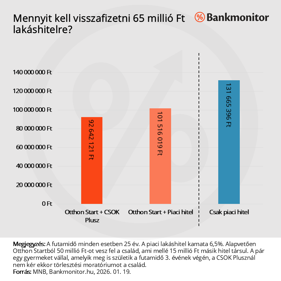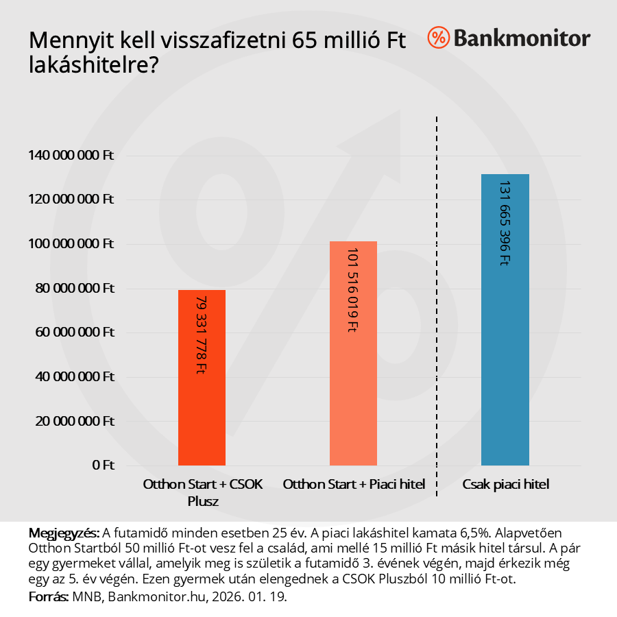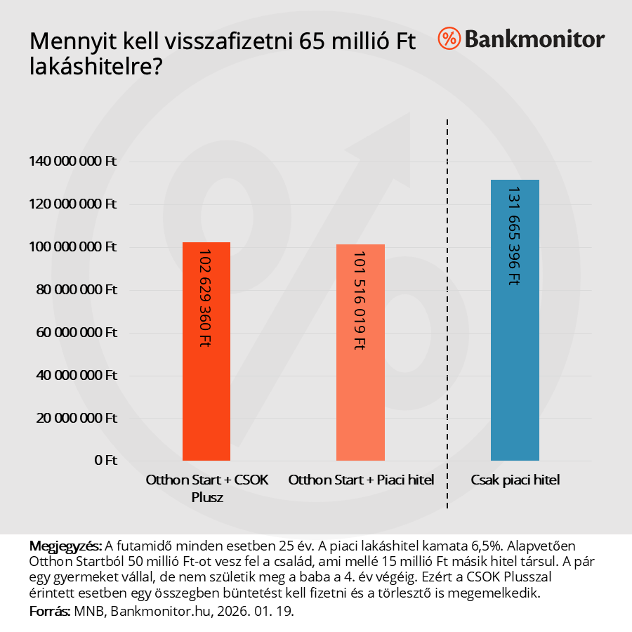 Ha az Otthon Start mellé a maradék 15 millió forintot 6,5 százalékos kamatozású piaci hitelből venné fel a pár, akkor az induló havi törlesztőrészlet 398 645 forint lenne, a teljes visszafizetendő összeg a 25 év alatt 101 516 019 forint lenne. Vagyis a két lakástámogatás kombinálásával 8,8 millió forintot nyer a család.