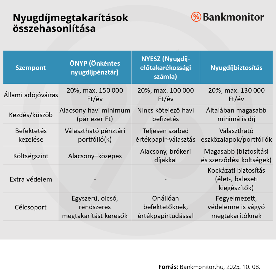 Ha például garantálni szeretnénk, hogy 65 évesen hozzáférjünk a megtakarításunkhoz – nyugdíjkorhatár emelkedésétől függetlenül -, érdemes nyugdíjbiztosítást kötnünk. Komoly pénzügyi tudás és rendelkezésre álló idő esetében érdemes lehet NYESZ-ben gondolkozni. Ha pedig egy menedzselt befektetést szeretnénk, és semmi többet, az ÖNYP egy jó választás lehet.