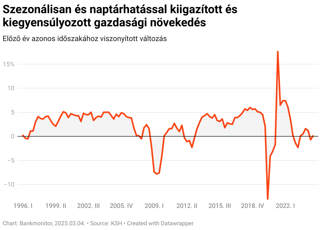 2024 IV. negyedévében az ipar teljesítménye 1,6%-kal zsugorodott, ezen belül a feldolgozóipar 3,5%-os visszaesést könyvelt el. A feldolgozóipar visszaeséséhez leginkább a közúti járműgyártás, a villamos berendezések gyártása, valamint a számítógép-, elektronikai és optikai termékek gyártása járult hozzá. Ezzel szemben a szolgáltató szektor 2,1%-kal bővült, amit elsősorban a vendéglátás és a kereskedelem lendületes növekedése hajtott. A gazdaságot tehát kettősség jellemezte: míg az ipar fékezte a teljesítményt, a szolgáltatások jelentős húzóerőként segítették a GDP 0,4%-os növekedését a III. negyedévhez képest (naptárhatással már csak 0,1%-os növekedés).