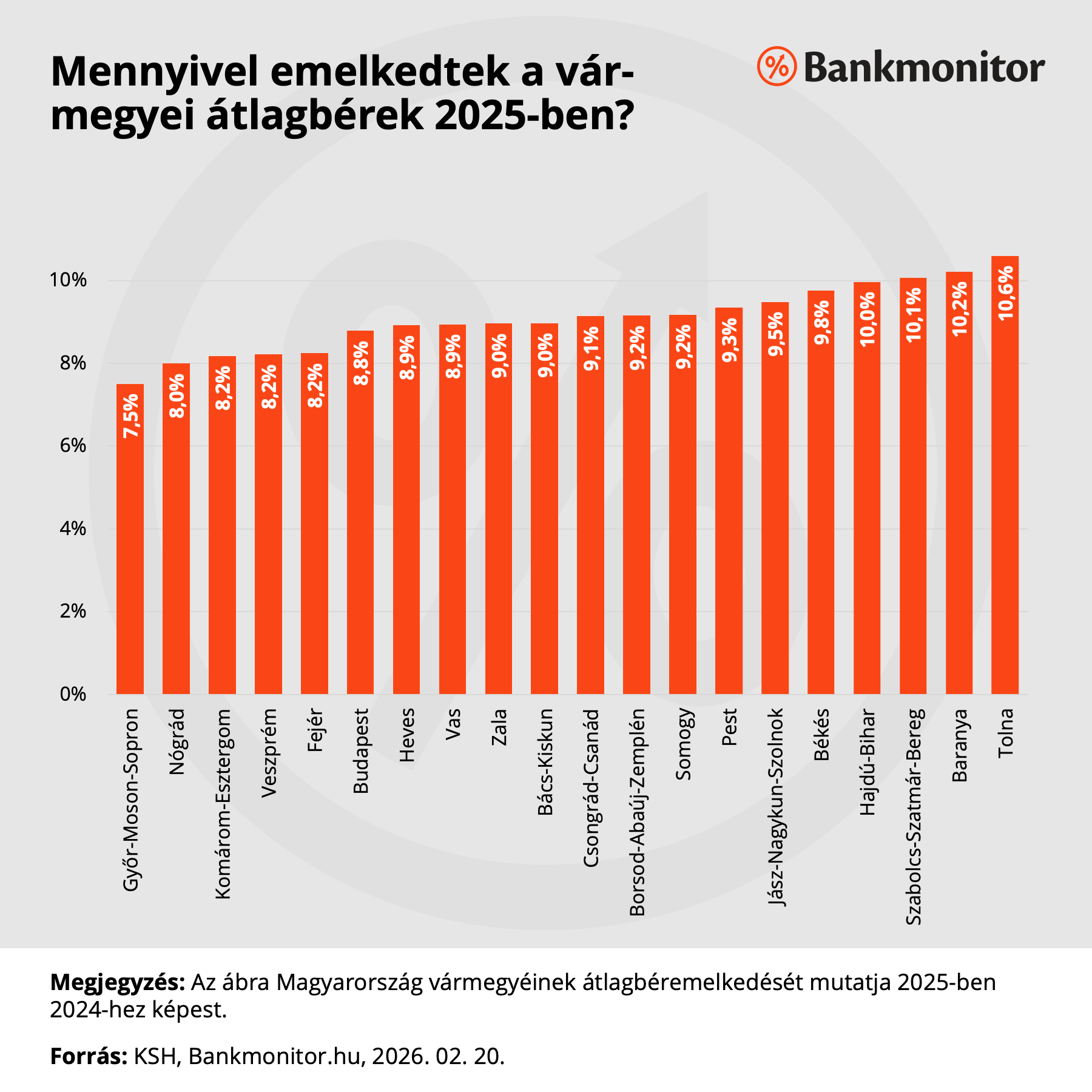 A Budapest és vidék közötti bérszakadék folyamatosan szűkül. Míg 2019-ben a legalacsonyabb bruttó átlagkeresettel bíró Szabolcs-Szatmár-Bereg megye bérszínvonala a budapestinek csupán 55,6 százalékát érte el, ez az arány 2025-re 61,5 százalékra emelkedett. Tehát az alacsonyabb átlagbérekkel rendelkező vármegyék felzárkózási folyamata, ha tyúklépésben is, de halad.