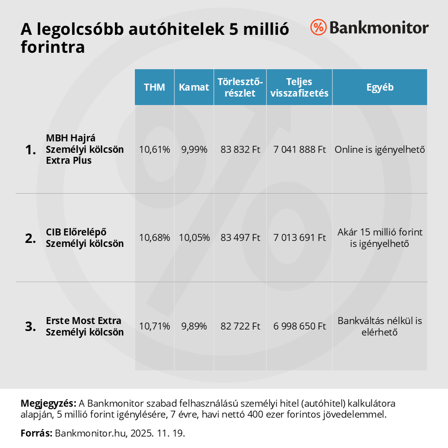 A piacon a legkedvezőbb autóhitelek jelenleg akár 10% alatti hitelkamattal is elérhetők. THM szerinti sorrendben 2025 novemberében az MBH Bank Hajrá Személyi Kölcsöne a legkedvezőbb, de a CIB és az Erste Bank ajánlatai sem maradnak el sokkal. Sőt, ha a kamatok szerint állítunk fel sorrendet, akkor már az Erste Most Személyi kölcsön érkezik a dobogó legfelső fokára. A CIB mellett pedig az aktuális Black Friday akció lehet erős érv, hiszen aki 2025. november 30-ig igényel, az akár 100 ezer forint extra jóváírással lehet gazdagabb.