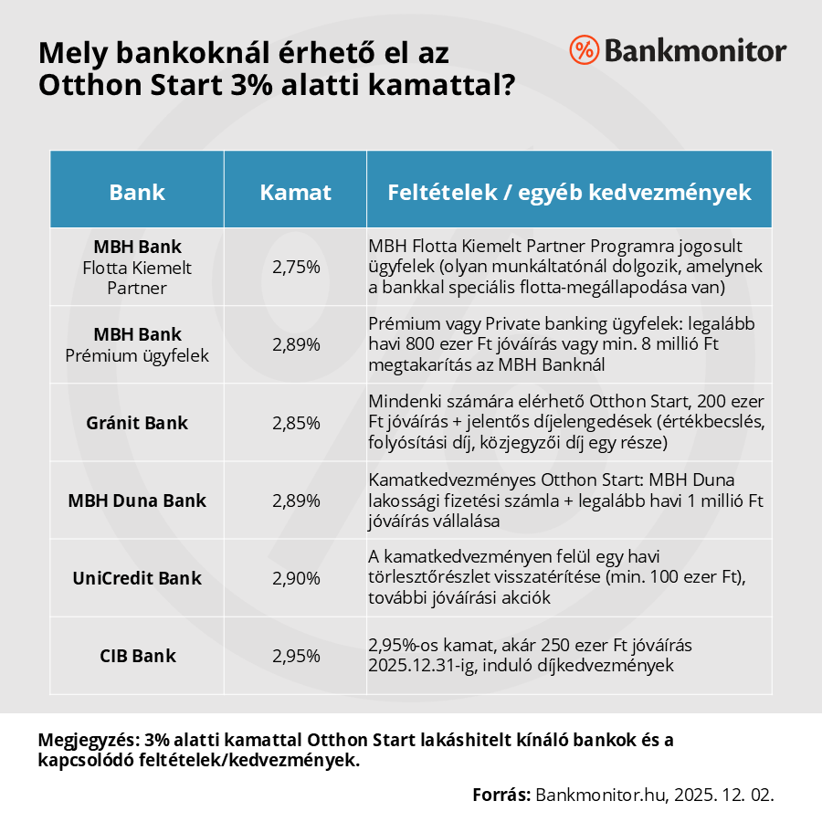 Az MBH Duna Bank mellett több további pénzintézet is kínál 3 százalék alatti kamatozást az Otthon Start hitelre. Az alábbi táblázat mutatja a jelenlegi piaci helyzetet:
