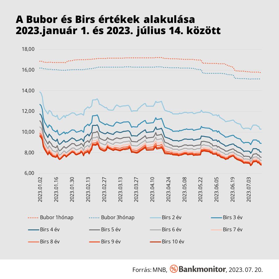 A forinthitelezést befolyásoló két mutató alakulása az idén már valóban biztató: miután a Magyar Nemzeti Bank megkezdte a monetáris szigorítást (előbb a kamatfolyosó szűkítésével, majd az egynapos betéti kamat csökkentésével, egyelőre két lépésben 18 százalékról 16 százalékra) a Bubor és a Birs fixingek is ereszkednek. Az 1 hónapos Bubor a 17 százalék fölötti szintről július közepére 15,75, a 3 hónapos pedig 15,13 százalékig süllyedt. A 3 éves Birsnél a 11 százalék fölötti értékek 9 százalék alá értek, az 5 évesnél pedig a 10 százalék fölötti csúcsok után már 7,5 százalék körüli értékek láthatóak.
